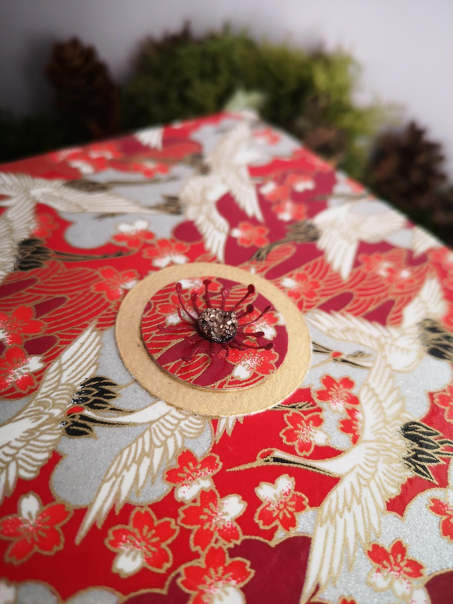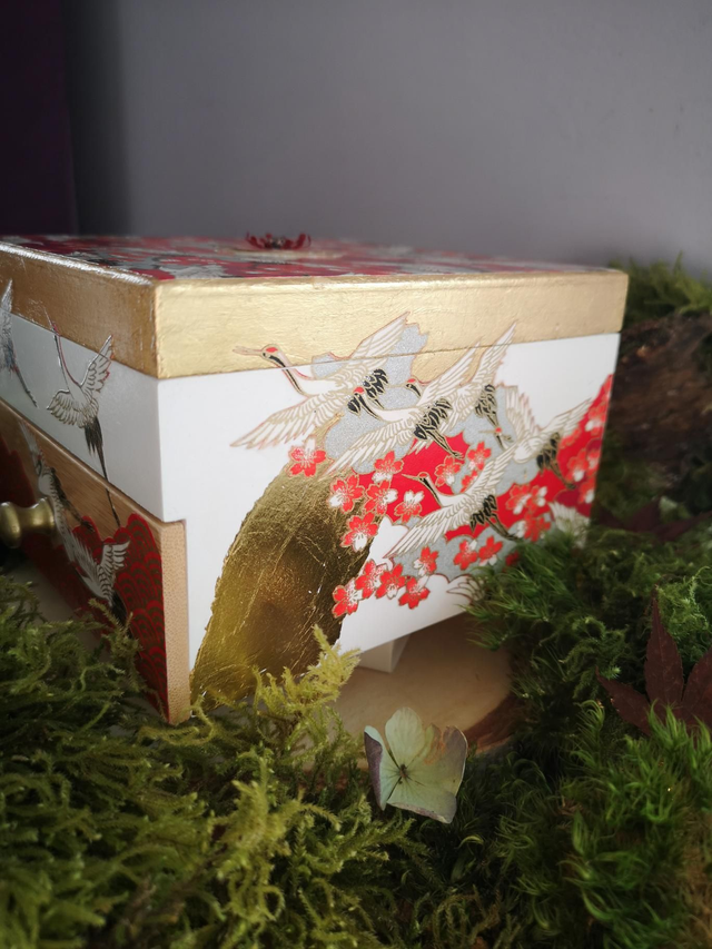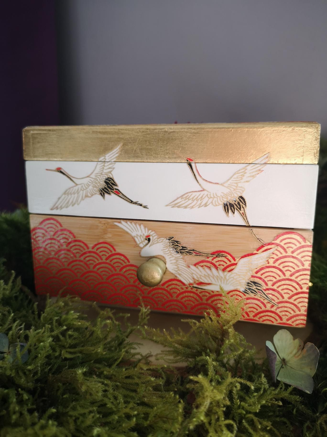 Cette boîte à bijoux en bois est décorée à la main avec du papier washi japonais et sublimée par une feuille de dorure, qui apporte éclat et raffinement. Le motif combine des grues blanches et des vagues rouges dans un style traditionnel, créant un objet à la fois fonctionnel et décoratif.