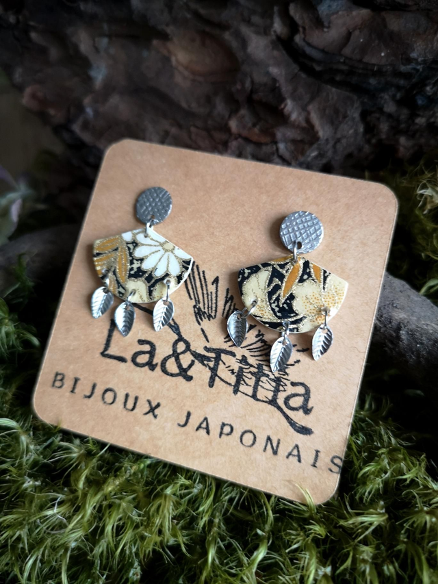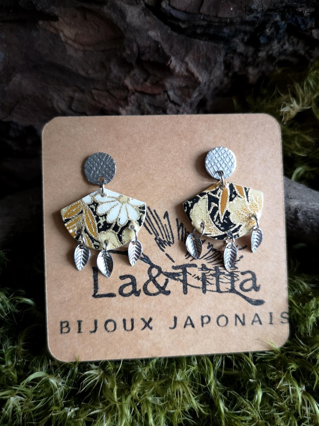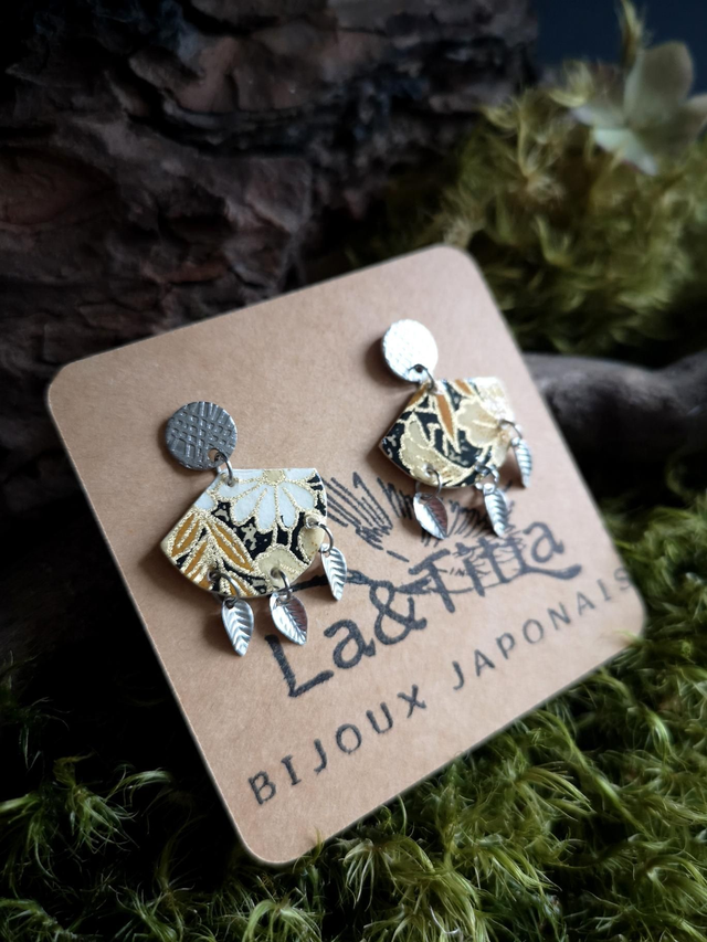 Boucles d’oreilles uniques allient élégance et raffinement. Réalisées à la main à partir de papier washi verni, avec motif fleurs.
