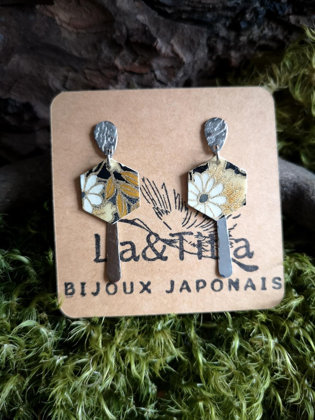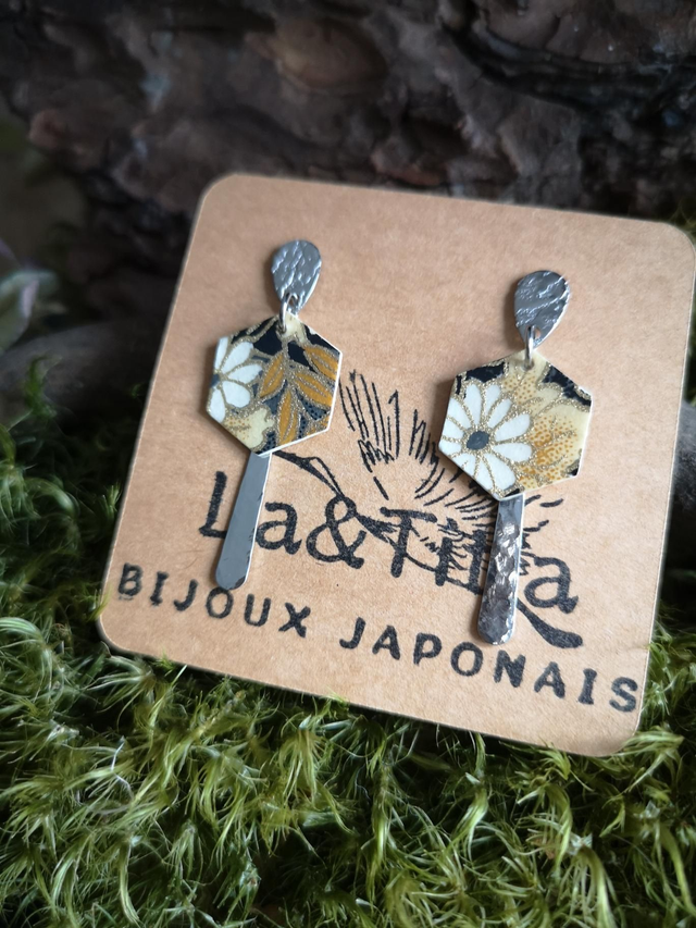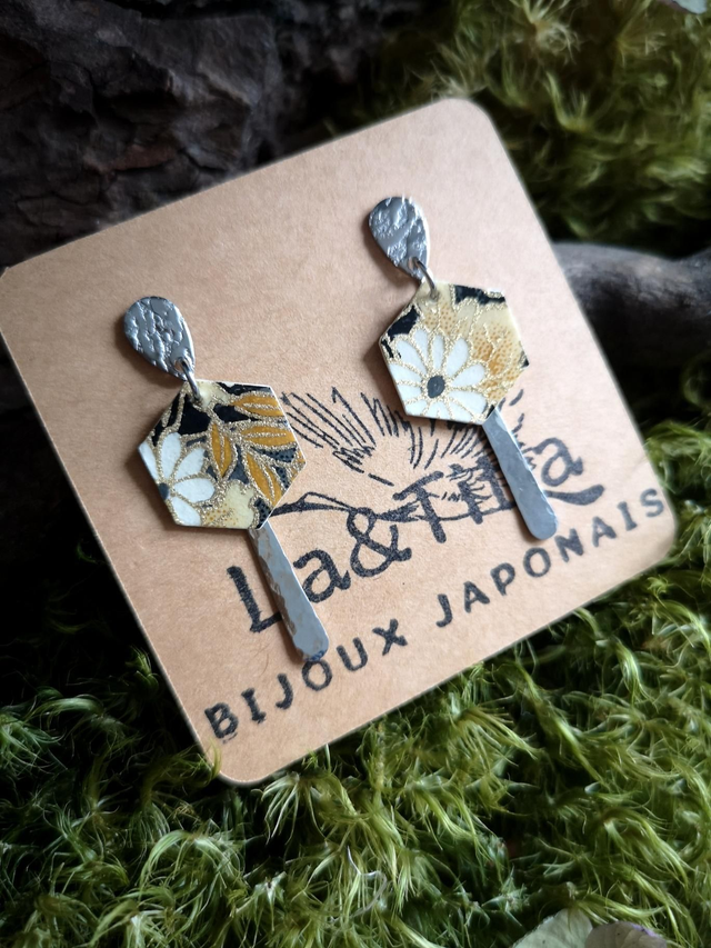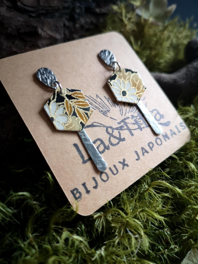 Boucles d’oreilles uniques allient élégance et raffinement. Réalisées à la main à partir de papier washi verni, avec motif fleurs.