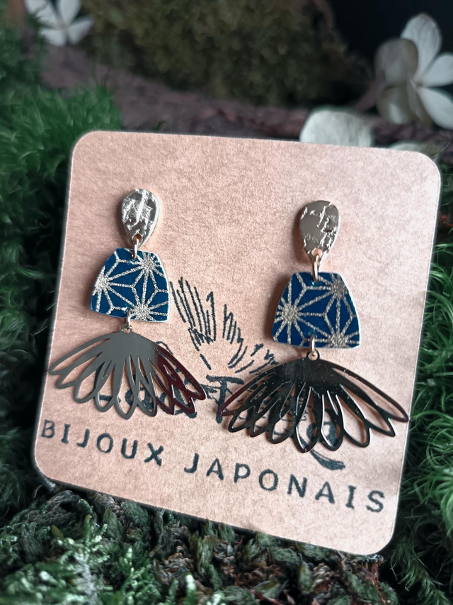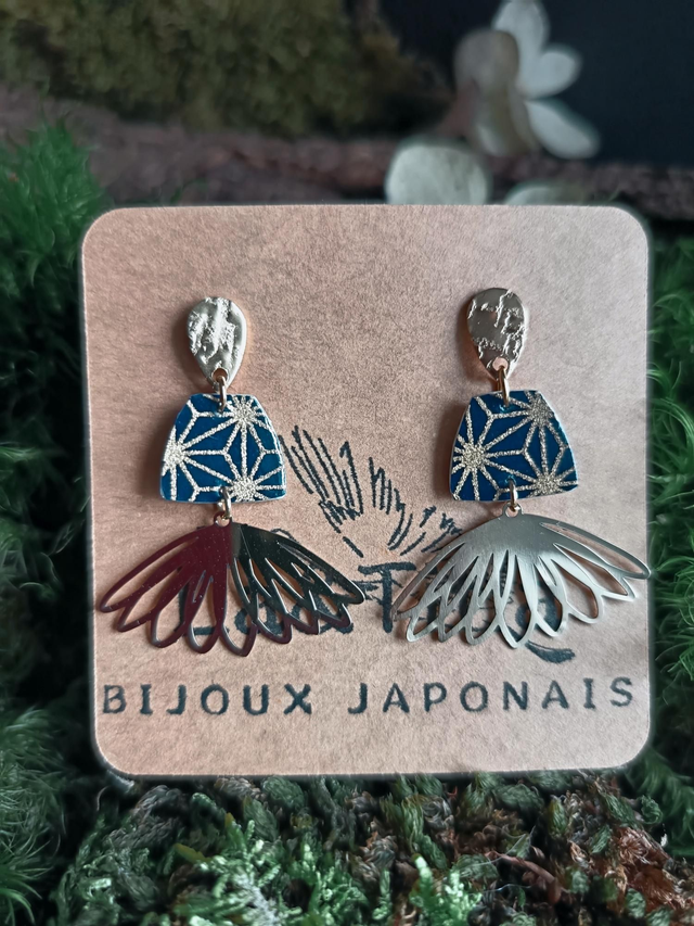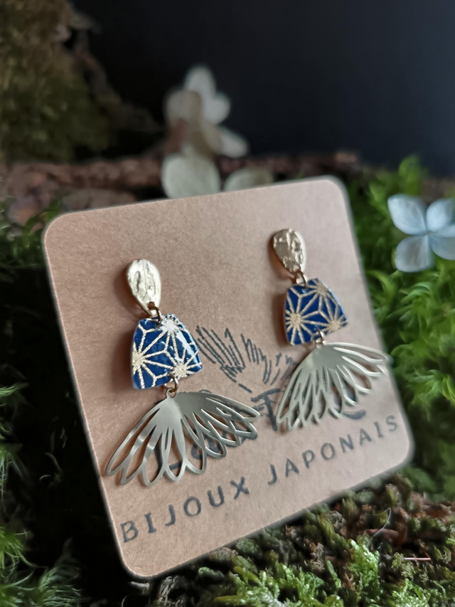 Réalisées à la main à partir de papier washi japonais, elles associent un bleu profond à de délicats motifs dorés, pour un bijou à la fois raffiné, léger et lumineux.