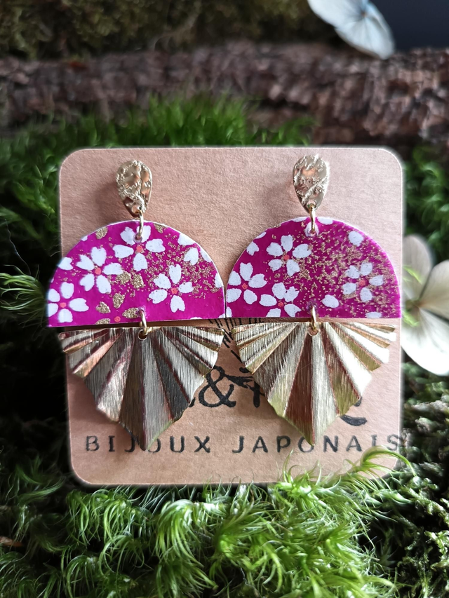 Ces boucles d’oreilles artisanales mettent à l’honneur le papier washi japonais, reconnu pour sa finesse et sa résistance. Chaque motif floral est soigneusement découpé et protégé, puis monté d'un éventail en laiton. Les touches dorées apportent de la lumière tandis que le fond fuchsia sublime le motif floral blanc. Un bijou délicat et poétique, léger à porter au quotidien comme pour une occasion spéciale.
