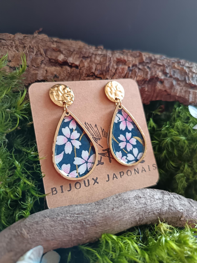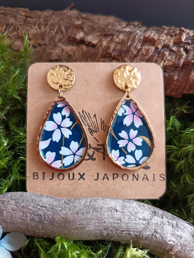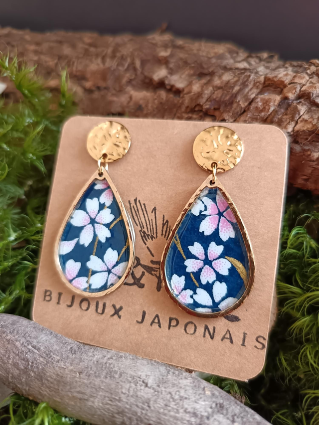 Élégantes et poétiques, les boucles d’oreilles Sakura bleu nuit mettent à l’honneur la délicatesse du papier washi japonais. Leur motif floral, inspiré des fleurs de cerisier, se détache sur un fond bleu profond rehaussé de touches dorées. Chaque paire est réalisée à la main, ce qui en fait un bijou unique, à la fois léger et raffiné.