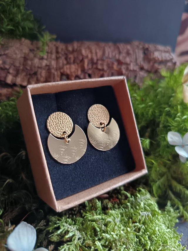 Ces boucles d’oreilles en laiton doré mettent à l’honneur le motif traditionnel Seigaiha, symbole japonais représentant des vagues stylisées à l’infini. Elles évoquent la sérénité, la force tranquille et la continuité, comme l’océan qui ne cesse jamais de danser.