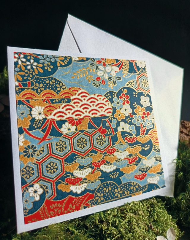 Carte réalisée à la main avec soin, décorée de véritable papier washi japonais. Chaque modèle est unique et met en valeur la finesse et la richesse des motifs traditionnels du Japon.