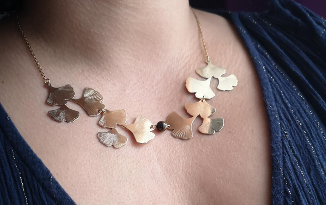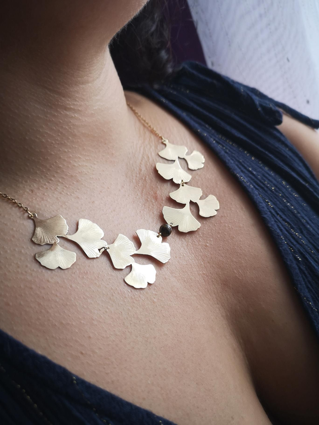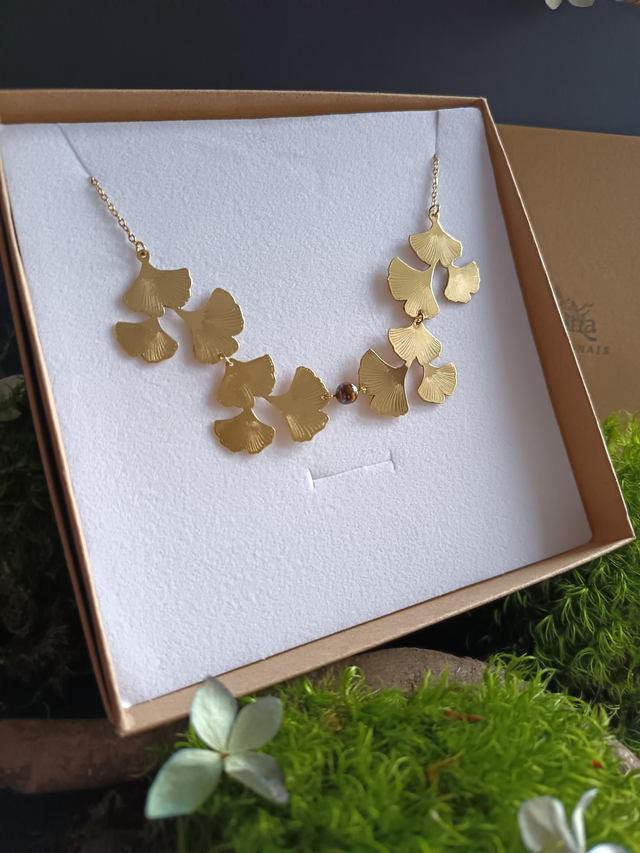 Collier - laiton - ginkgo - feuilles - perle - œil du tigre - La&Titia