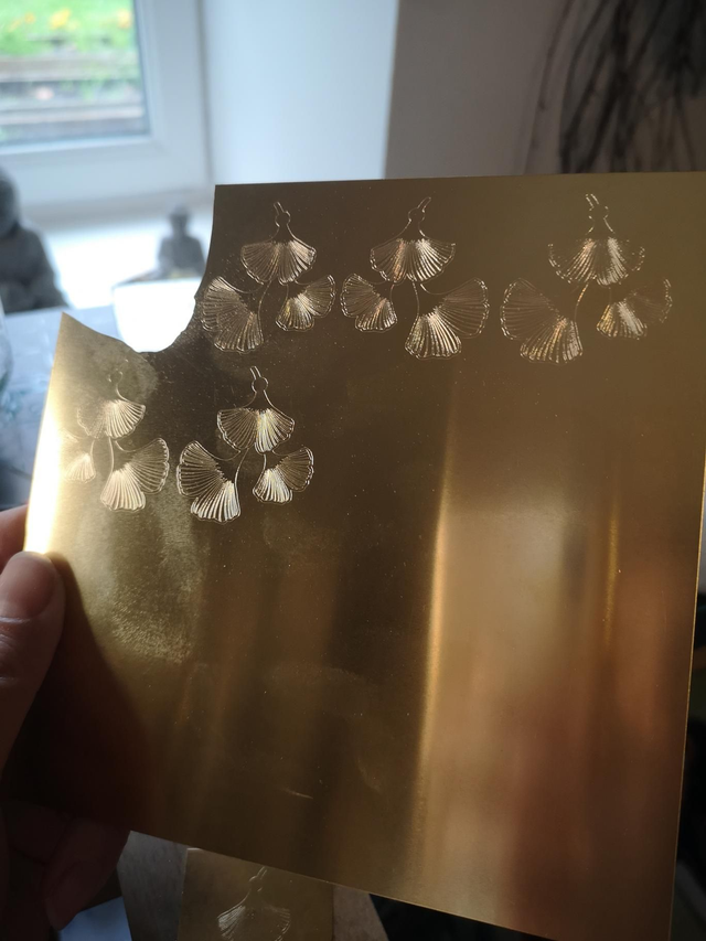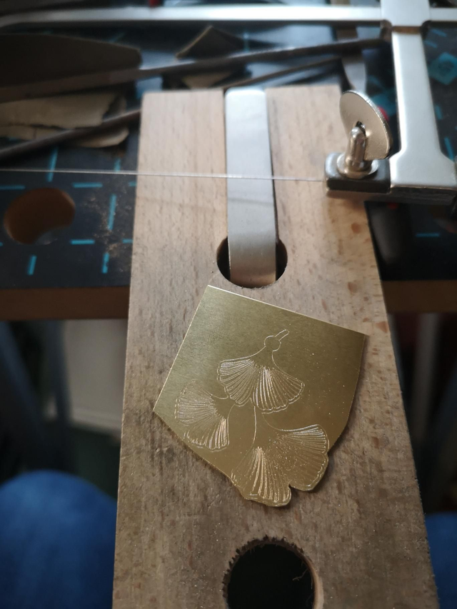 Chaque feuille est dessinée, puis gravée en machine afin de révéler ses nervures délicates. Les formes sont ensuite découpées à la scie de bijoutier, limées et polies à la main, une à une, pour obtenir un rendu doux et lumineux.