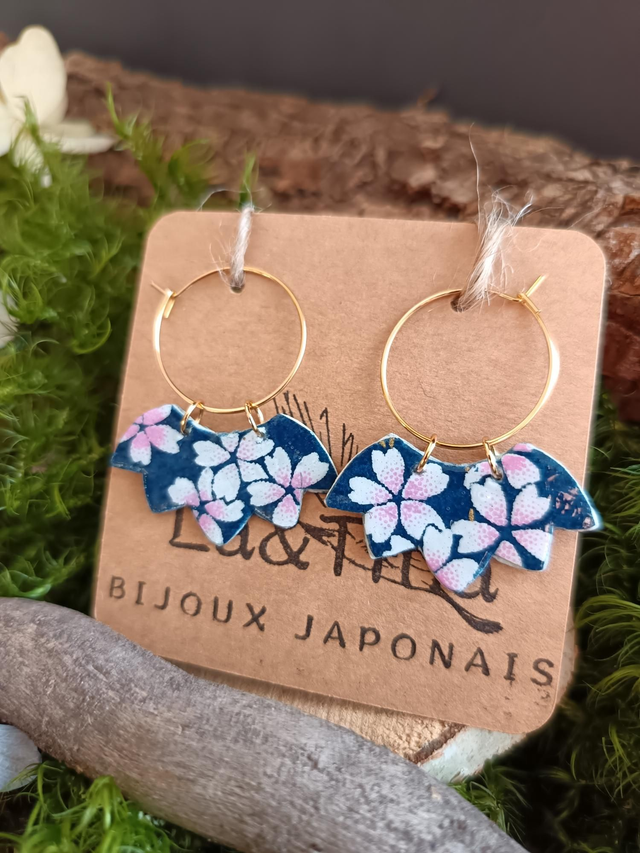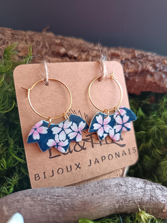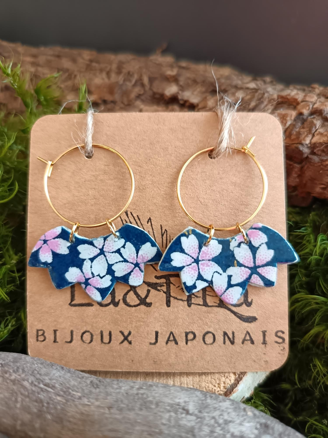 Élégantes et poétiques, les boucles d’oreilles Sakura bleu nuit mettent à l’honneur la délicatesse du papier washi japonais. Leur motif floral, inspiré des fleurs de cerisier, se détache sur un fond bleu profond rehaussé de touches dorées. Chaque paire est réalisée à la main, ce qui en fait un bijou unique, à la fois léger et raffiné.